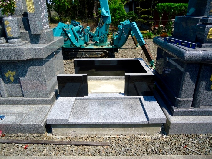 こちらは、墓石の設置中です。地震が来ても壊れないお墓になるよう、見えなくなる部分にも気を配って、据付を進めていきます。