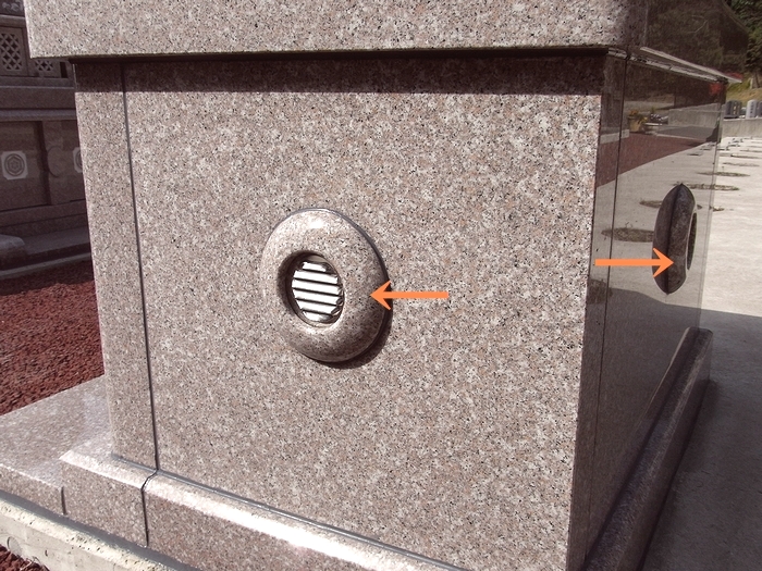 納骨室の空気口です。左右と後ろの3方向にあります。ステンレス製で、納骨室内部に湿気がたまらないようにしています。