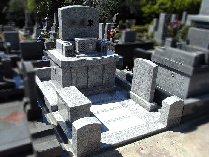 ●平尾霊園に、「楽」の字が印象的なフラットでバリアフリーのお墓建て替えが完了。家紋付きの花立ては再加工して活用、石張りのお墓へ
