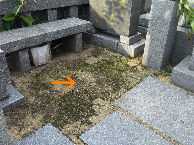 こちらはお墓の入り口の階段から入って、お参りするスペースの左側です。当日は苔が少し残っているくらいで、草は取り除かれている状態でした。