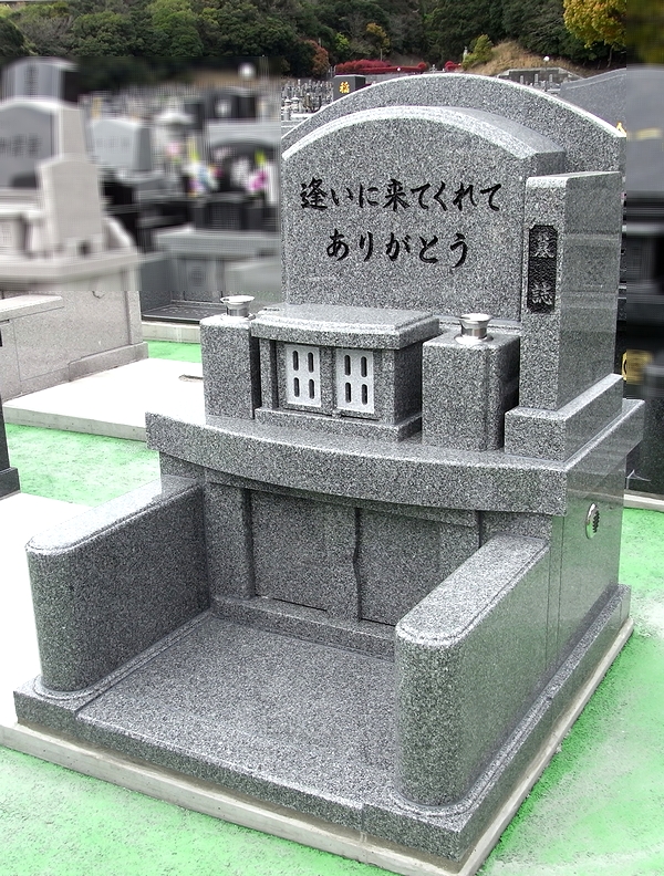 もともとはピンク等の違う色を選ばれていましたが、石の質の説明をさせていただいた際に、インド産のアーバングレイを気に入られ、最終的にはこの石になりました。正面の文字は、参考にしていただけますように家名を入れない場合によく彫刻される言葉等をお伝えし、お客様自ら考えられました。お参りに来られた方を笑顔にできる、素敵な言葉ですね^^