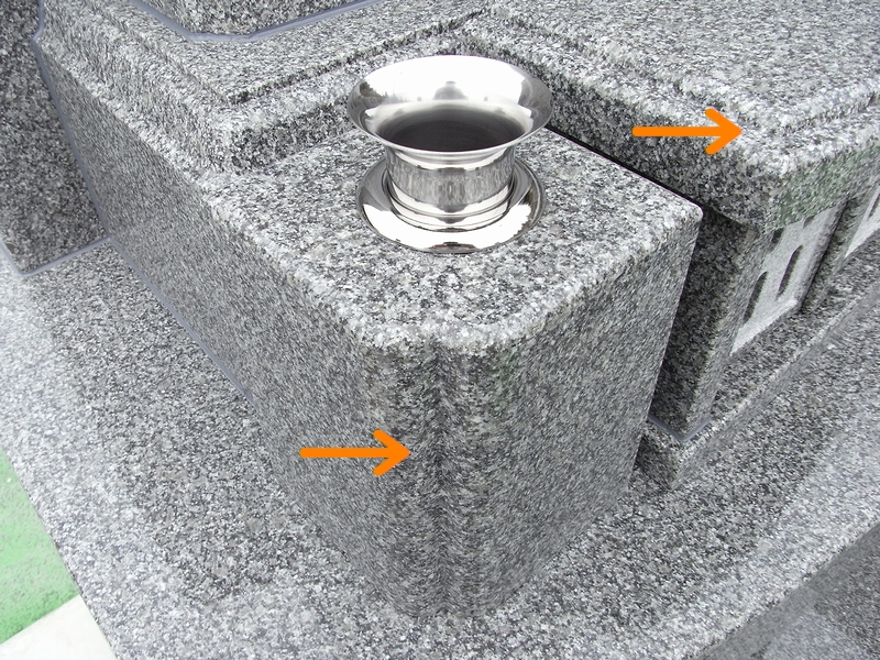石塔の頭の部分です。柔らかい雰囲気になりますよう、ゆるやかなR加工を二重に施しています。お客様のご希望で、石塔に背板がついたデザインとなっております。お掃除が大変になること、汚れが溜まりやすくなることを避けるため、そして強度アップにつながりますように、石塔と背板を接着させたデザインにしています。石と石の継目部分は、しっかりとシリコン目地で補強しています。