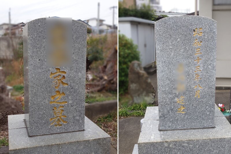 確認すると、昭和33年、もう60年以上前に建てられたお墓でした。そうは思えないほどきれいにされています。ただ、文字彫刻の金箔が取れかけて、見づらくなっているところもありました。お墓の文字に使用する金箔は、お墓の置かれた状況などによっても違いはありますが、だいたい15~20年ほどで入れ替えの時期を迎えます。